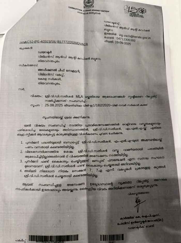 പുനര്ജനി പദ്ധതിയുടെ പേരില് വിദേശത്ത് നിന്ന് പണം പിരിച്ചതില് സതീശന് അഴിമതി നടത്തിയെന്നായിരുന്നു ആരോപണം. എന്നാല് വിജിലന്സ് എസ്.പി നല്കിയ റിപ്പോര്ട്ടില് പറയുന്നത് മറ്റൊന്നാണ്. പദ്ധതിക്കായി സമാഹരിച്ച തുക സതീശന്റെ വ്യക്തിഗത അക്കൗണ്ടിലേക്ക് വന്നിട്ടില്ല. പകരം, മണപ്പാട്ട് ഫൗണ്ടേഷന് എന്ന എന്.ജി.ഒയുടെ അക്കൗണ്ടിലേക്കാണ് പണമെത്തിയത്. വ്യക്തിപരമായി പണം കൈപ്പറ്റിയിട്ടില്ലെന്ന് വ്യക്തമായതോടെ അഴിമതി ആരോപണത്തിന്റെ മുനയൊടിഞ്ഞു. അങ്ങനെ സസീശനെതിരെ തെളിവില്ലെന്ന് ഔദ്യോഗികമായി തന്നെ സ്ഥിരീകരിക്കപ്പെട്ടിരിക്കുന്നു.